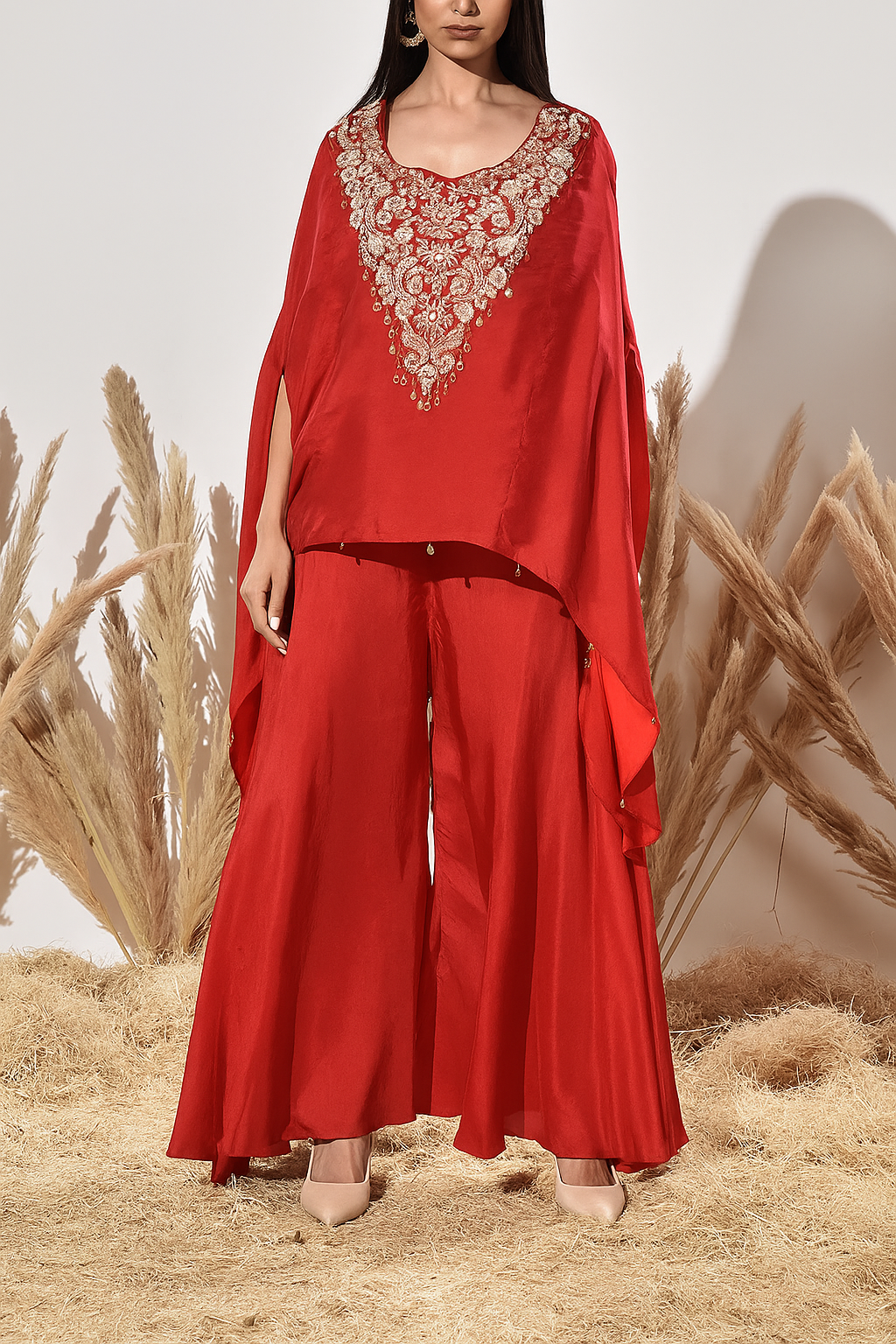 The royal shade of red with elegant hand embroidery on the chest —